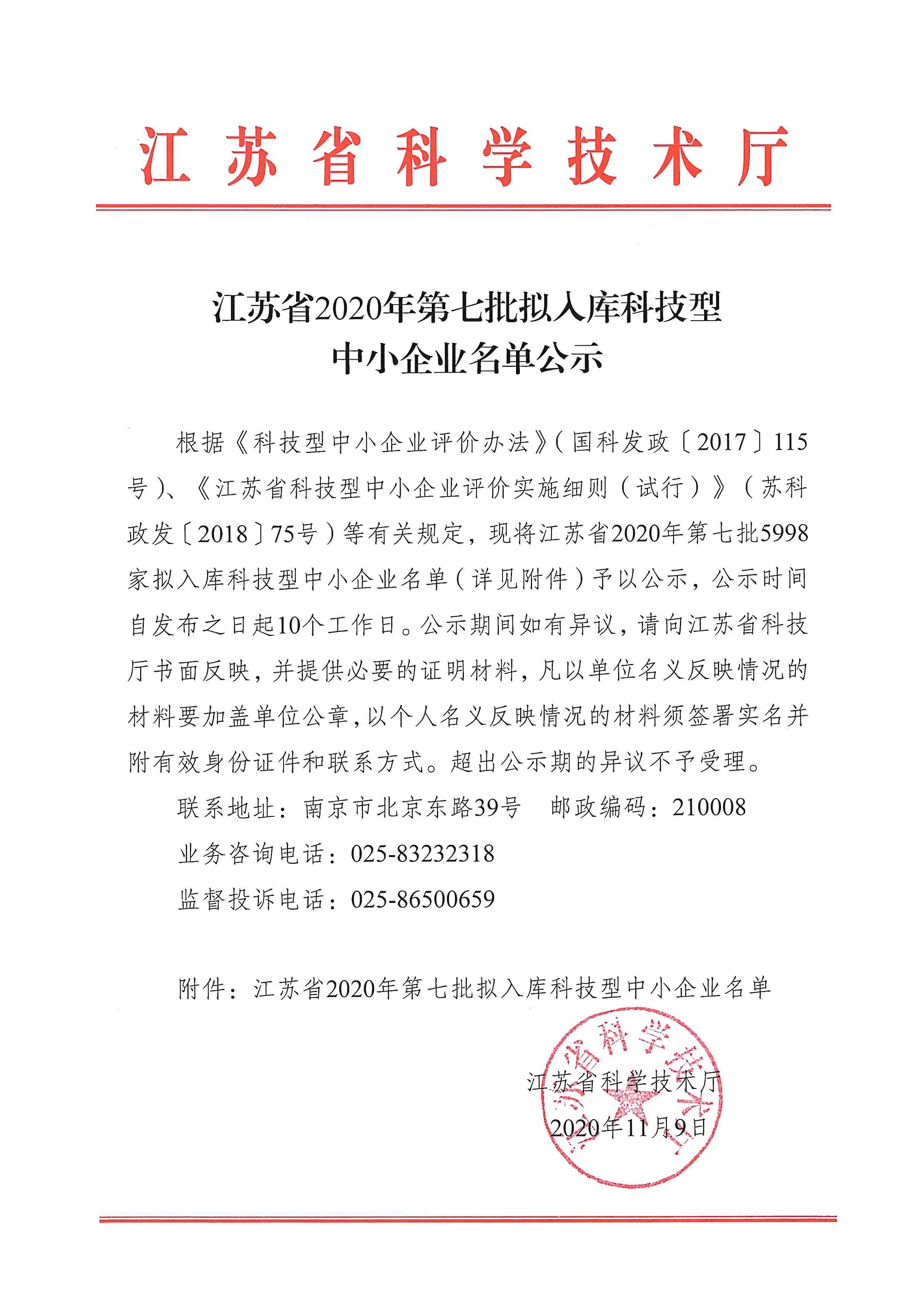 江苏省2020年第七批拟入库科技型中小企业公示名单